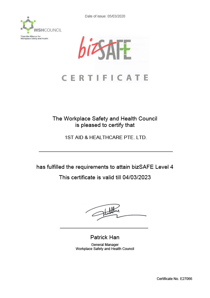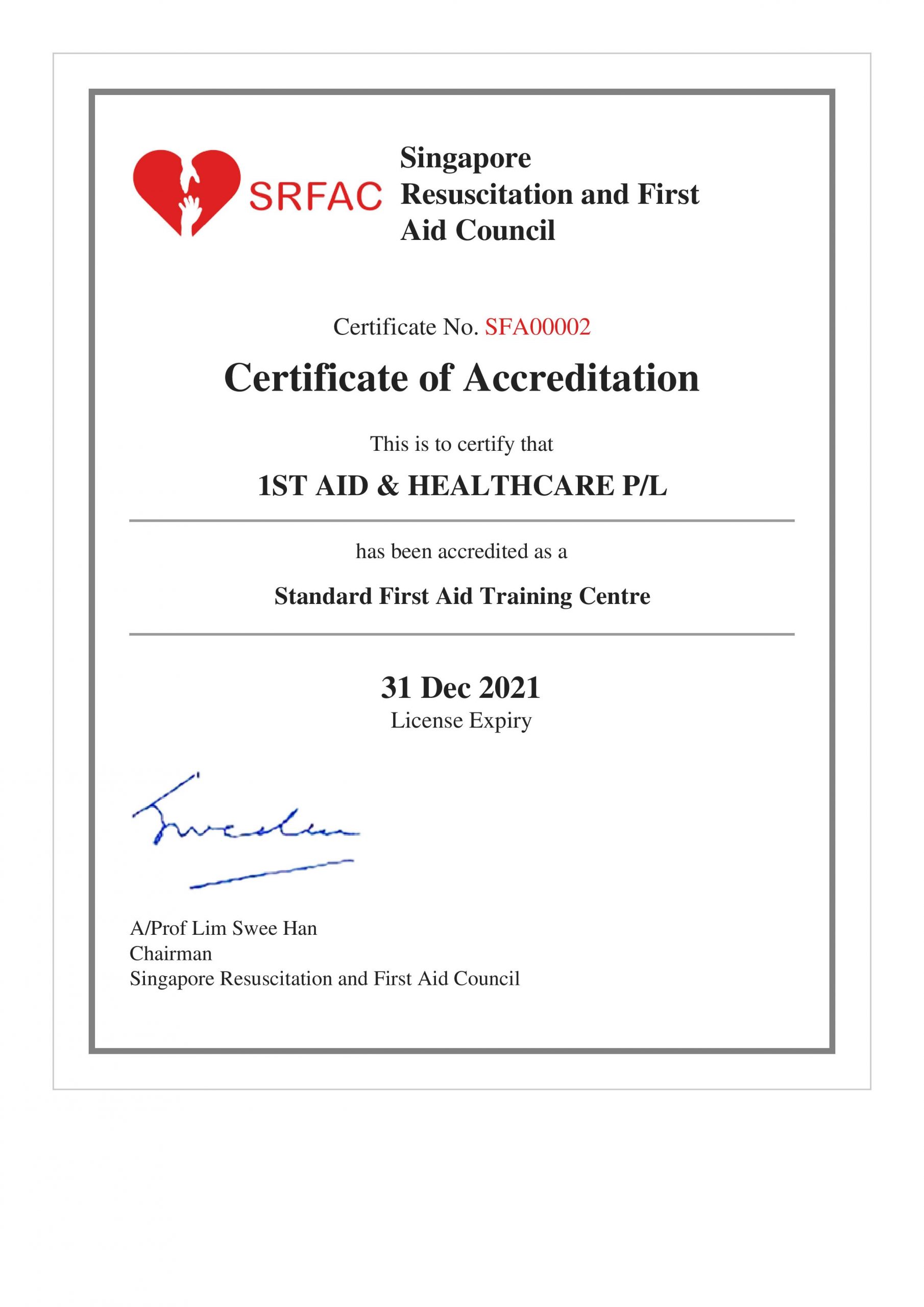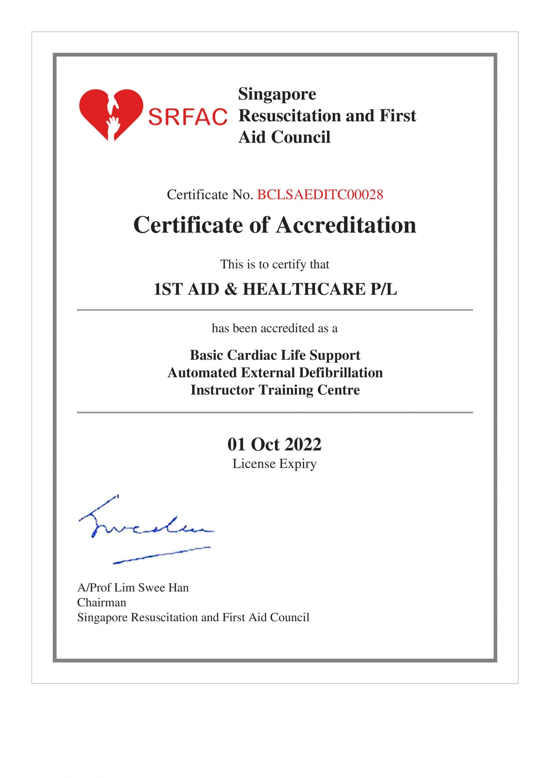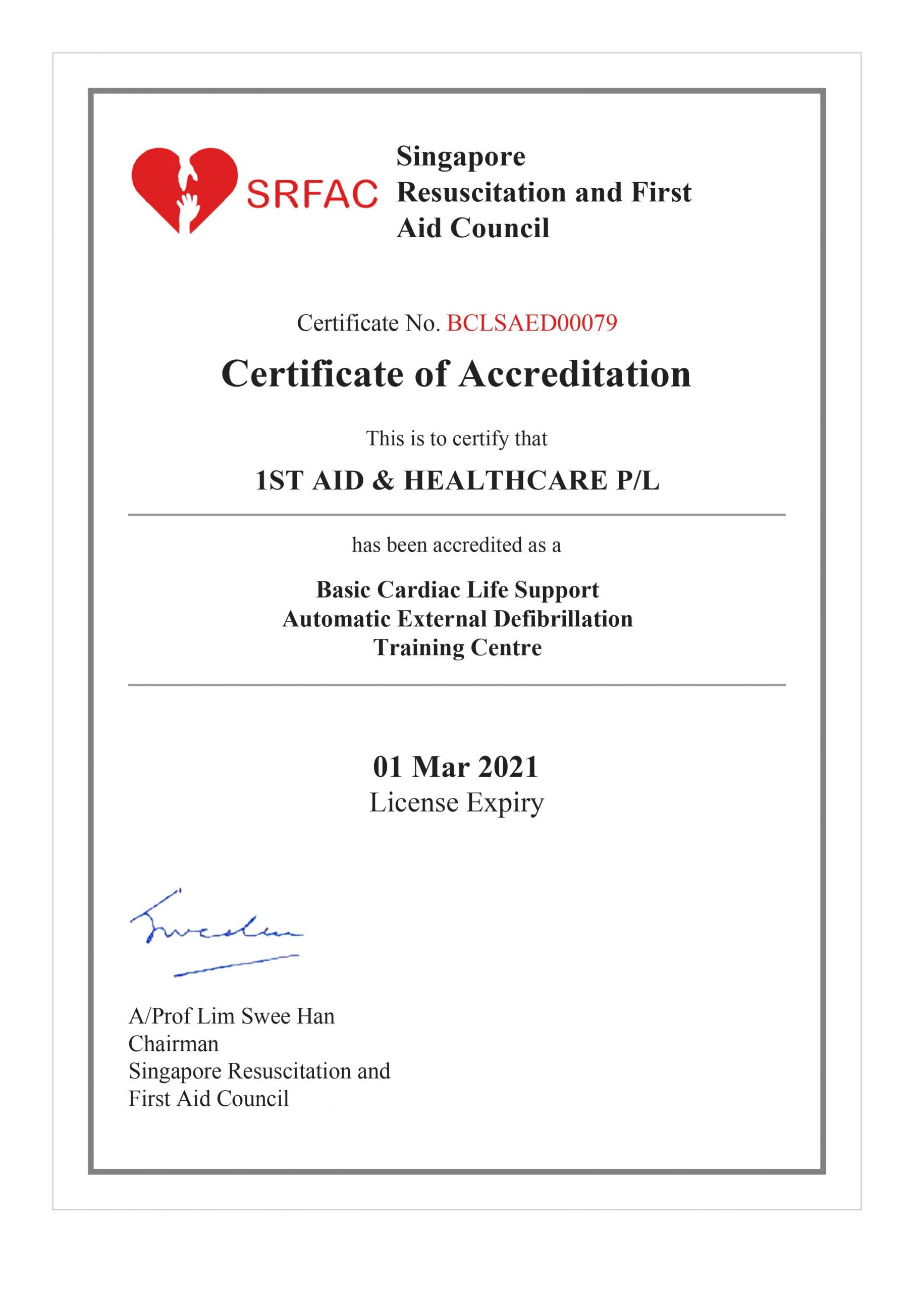 1ST Aid + Healthcare Learning Center has obtain accreditation certificate from SRFAC, ECDA, Bizsafe4 and ISO 29993:2017 to conduct 1ST Aid and Life Support training.